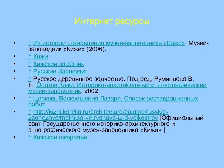 Интернет ресурсы • • ↑ Из истории становления музея-заповедника «Кижи» . Музейзаповедник «Кижи» (2006). ↑ Кижи ↑ Кижский заказник ↑ Русские Заонежья ↑ Русское деревянное зодчество. Под ред. Румянцева В. Н. Остров Кижи. Историко-архитектурный и этнографический музей-заповедник. 2002. ↑ Церковь Воскрешения Лазаря. Список реставрационных работ. ↑ http: //kizhi. karelia. ru/architecture/catalog/russkiezaonezhya/melnitsa-vetryanaya-iz-d-volkostrov |Официальный сайт Государственного историко-архитектурного и этнографического музея-заповедника «Кижи» | ↑ Кижское ожерелье