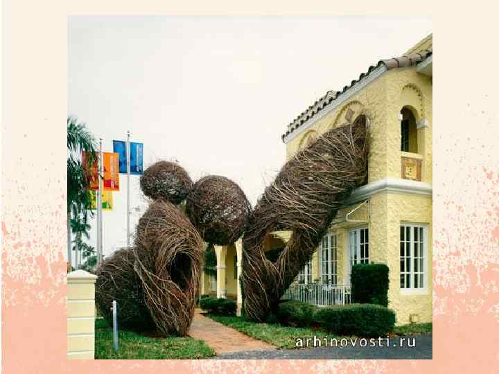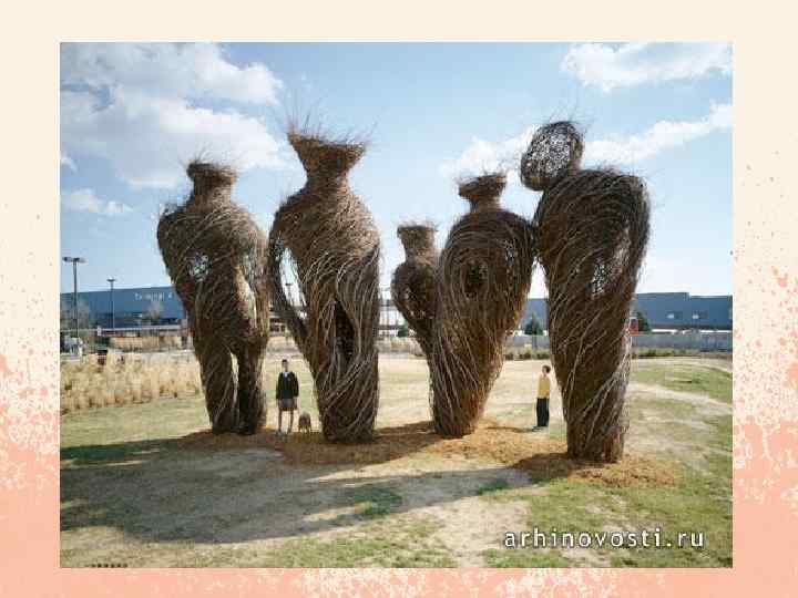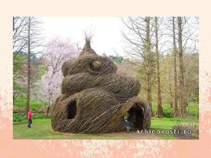 Patrick Dougherty Объединив свои ремесленнические умения с любовью к природе, а также знаниями о примитивных технологиях строительства, Патрик Доэрти (Patrick Dougherty) начал свои эксперименты с использованием саженцев деревьев в качестве строительных материалов. В 1980 -м он создал несколько небольших работ, прямо у себя во дворе, затем перешел к концептуальным и монументальным инсталляциям, для возведения которых уже требовались грузовые подъемники. На сегодняшний день ему удалось построить около двухсот подобных крупномасштабных скульптур по всему миру. Ландшафтный дизайнер Патрик Догерти собирает материал для своих ландшафтных инсталляций исключительно в местных садах и питомниках. Оборвав листики на ветках, художник лично проверяет качество и гибкость привезенных ему прутиков. Чтобы свить одну такую креативную инсталляцию Патрик Догерти заказывает грузовик «строительного» материала! Эти инсталляции лишь слегка по внешней форме напоминают гнезда. Наверное, в прошлой жизни скульптор из Северной Каролины был птицей. Причем обязательно той, которая вьет себе гнезда, – такие большие, добротные птичьи домики. Хитросплетения из прутиков и палочек называются "stickwork", и являются одной из разновидностей ландшафтного дизайна. Красуются эти композиции в садах королевских резиденций, знаменитых музеев, дендропарков и на приусадебных участках состоятельных людей, звезд шоу-бизнеса, спорта и политики.