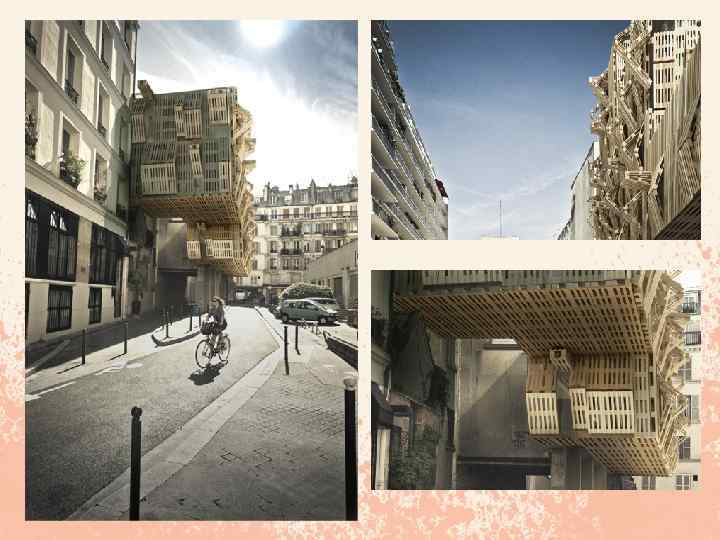 Бюро Stephane Malka По оценкам специалистов, палет, деревянных поддонов для транспортировки грузов, на земном шаре уже, наверное, больше, чем людей. А в промышленно развитых странах – больше в несколько раз. Цифры впечатляют и ужасают: ежегодное производство насчитывает до полумиллиарда штук, и большинство из них – увы, одноразового использования. Так что повторное применение палет – идея не только заманчивая, но и более чем актуальная. Свою лепту в решение проблемы вносят и дизайнеры с архитекторами. Среди архитектурно-палетных объектов встречаются настоящие шедевры: павильон Pupa Лиама Хопкинса для Bloomberg, Palettenpavillon Маттиаса Леберманна и даже домполуфабрикат (конкурсная работа студентов Венского университета). Одно из последних произведений на палетную тему – инсталляция Ame-lot архитектора Алис Барруа и дизайнера-графика Тристана Спелла из бюро Stephane Malka. И хотя идея палет как строительных модулей не нова, авторы придумали оригинальный способ использовать их парами, скрепляя при помощи самых примитивных карточных петель, что позволяет варьировать расположение двух палет относительно друга – от горизонтальной плоскости в 1800 и до очень острого угла. Такой подход позволил авторам собрать впечатляющий своим замысловатым «рельефом» объект со сложной и неординарной геометрией. Вся конструкция размещается в полунише, образованной двумя глухими стенами, на здании студенческого общежития на парижской улице Амело.