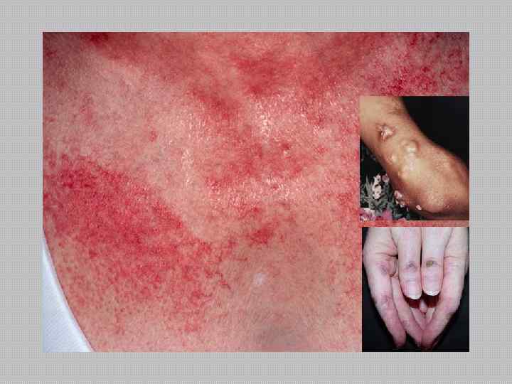 Дифференциальный диагноз Следует проводить дифференциальный диагноз дерматомиозита и других диффузных заболеваний соединительной ткани. Эритема на лице в сочетании с лихорадкой, поражением суставов и различными висцеритами требует исключить прежде всего системную красную волчанку, при которой кожные изменения имеют более яркий оттенок, в то время как для дерматомиозита характерна лиловая эритема. Волчаночный миозит более быстро поддается кортикостероидной терапии. Системной красной волчанке свойственны такие изменения, как панцитопения, наличие LE-клеток и АНФ в крови, в то время как активному дерматомиозиту - высокий уровень ферментов сыворотки крови, гиперкреатинурия. Иногда ранние клинические признаки дерматомиозита (артралгии, полиартрит, поражение сердца в сочетании с лихорадкой) служат основанием для первичного диагноза ревматизма или ревматоидного артрита. Однако лиловая эритема и поражение скелетных мышц (слабость, отеки, боли) помогают правильно распознать заболевание.