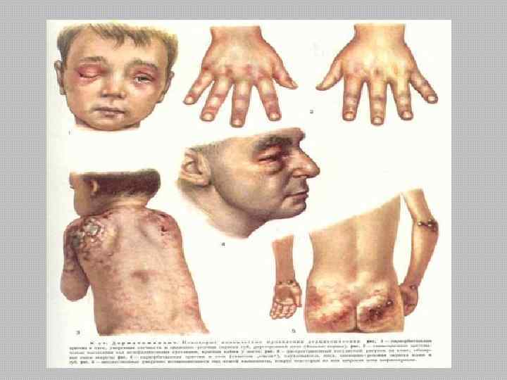 Патоморфология Поражения кожи, подкожных тканей и мускулатуры распределены неравномерно, поэтому для биопсии необходимо выбирать участки с типичными изменениями. У детей самым характерным поражением является васкулит артериол, венул и капилляров соединительных структур кожи, подкожных тканей и мускулатуры. В мышцах отмечаются рассеянные участки дегенерации, атрофии и регенерации мышечных волокон, интерстициальный отек и пролиферация соединительной ткани. Для пораженных участков кожи характерны истончение эпидермиса, отек и васкулит дермы. Васкулит желудочно-кишечного тракта может быть причиной изъязвления слизистых и инфаркта тканей. Описаны умеренные изменения почечных клубочков.