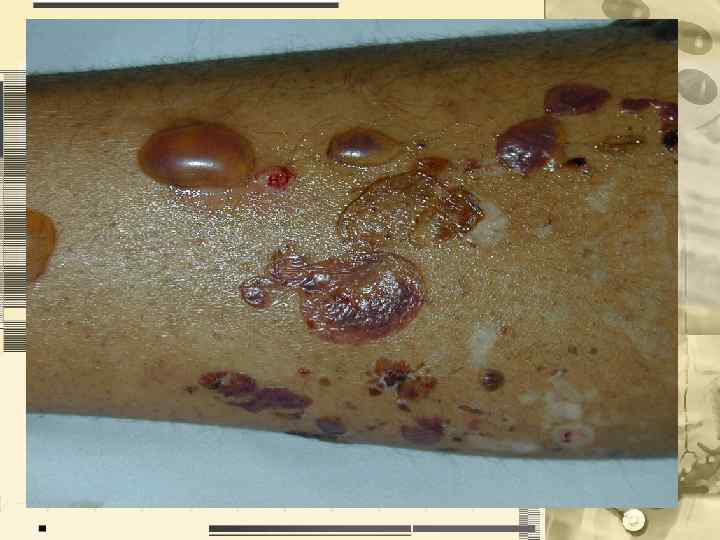 Пузырь (bulla) Элемент, подобный пузырьку, но большей величины: от 5 мм до 5 см и более. Содержимое его может быть прозрачным, мутным или геморрагическим. Расположение: • подроговое • внутриэпидермальное • подэпидермальное