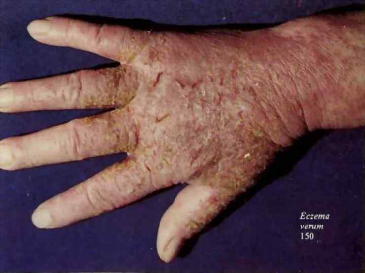 Профессиональная экзема локализуется преимущественно на открытых участках кожного покрова, подвергающихся воздействию профессиональных раздражителей, развивается, как правило, у больных профессиональным аллергическим дерматитом и проявляется эритемой, везикуляцией, папулезными высыпаниями, мокнутием и зудом. Прекращение контакта кожи с аллергеном не приводит к быстрому излечению, как при дерматите, а кожные пробы показывают, что у этих больных в большинстве случаев имеется поливалентная сенсибилизация вместо бывшей ранее моновалентной. Кожные пробы с профессиональными аллергенами иммуноаллергические, которые ставят in vitro, могут быть положительными в течениональная экзема.