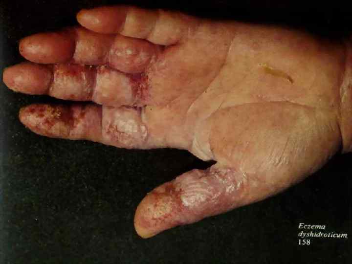 Дисгидротическая экзема характеризуется образованием мелких, величиной с булавочную головку, плотных на ощупь пузырьков на боковых поверхностях пальцев, иногда на коже ладоней и подошв. Реже встречаются крупные, многокамерные пузыри. Располагаясь в эпидермисе, пузырьки просвечивают сквозь него, напоминая зерна сваренного риса. Субьективно больные часто испытывают сильный зуд. Пузырьки могут вскрываться, превращаясь в ссадины, или подсыхают, образуя плоские, желтоватого цвета корочки. В дальнейшем возникают резко ограниченные очаги поражения с отчетливо выраженной воспалительной окраской, что отличает дисгидротическукю экзему от дисгидротической эпидермофитии (в покрышках пузырей на своде стоп находят нити мицелия гриба эпидермофитона).