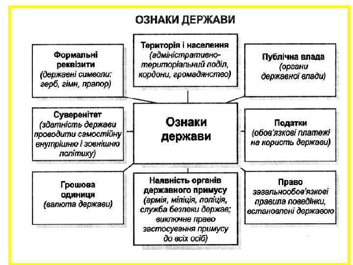 Ознаки держави: • Публічна влада. Влада не є тотожною з населенням, а виступає від його імені, забезпечує примус у вигляді органів державної влади.