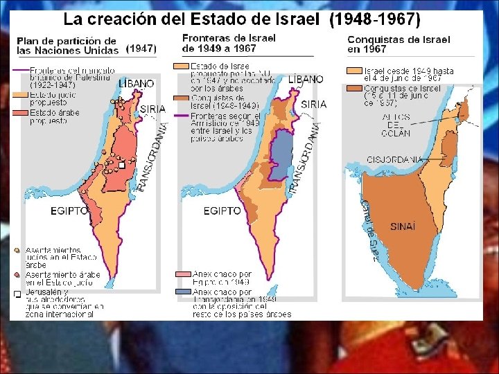 • Egipto, Irak, Líbano, Yemen, Siria, Arabia Saudita forman la Liga Árabe, que se enfrenta en una guerra a Israel. Pero Israel, al contar con el apoyo de EE. UU. está en superioridad y vence, ampliando sus territorios.