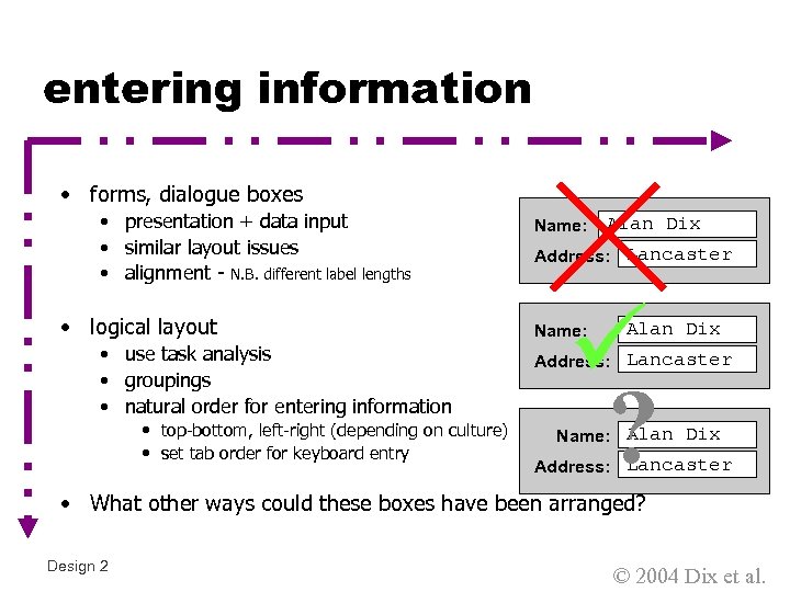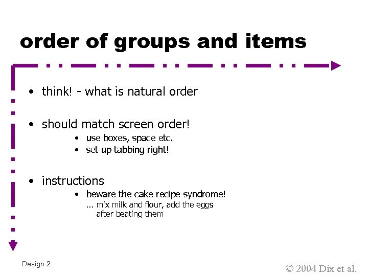 order of groups and items • think! - what is natural order • should match screen order! • use boxes, space etc. • set up tabbing right! • instructions • beware the cake recipe syndrome! … mix milk and flour, add the eggs after beating them Design 2 © 2004 Dix et al.