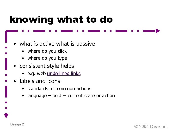 knowing what to do • what is active what is passive • where do you click • where do you type • consistent style helps • e. g. web underlined links • labels and icons • standards for common actions • language – bold = current state or action Design 2 © 2004 Dix et al.