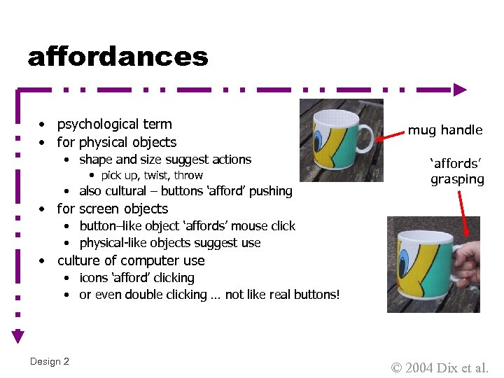 affordances • psychological term • for physical objects • shape and size suggest actions • pick up, twist, throw • also cultural – buttons ‘afford’ pushing mug handle ‘affords’ grasping • for screen objects • button–like object ‘affords’ mouse click • physical-like objects suggest use • culture of computer use • icons ‘afford’ clicking • or even double clicking … not like real buttons! Design 2 © 2004 Dix et al.
