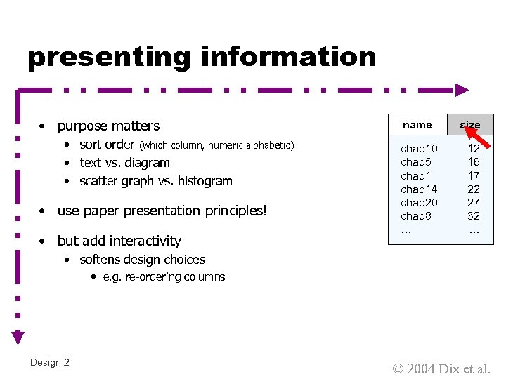presenting information • purpose matters • sort order (which column, numeric alphabetic) • text vs. diagram • scatter graph vs. histogram • use paper presentation principles! • but add interactivity name size chap 10 chap 1 chap 5 chap 10 chap 11 chap 14 chap 12 chap 20 chap 13 chap 8 chap 14 …… 12 17 16 12 17 51 22 262 27 83 32 22 … • softens design choices • e. g. re-ordering columns Design 2 © 2004 Dix et al.