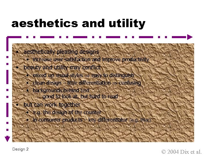 aesthetics and utility • aesthetically pleasing designs • increase user satisfaction and improve productivity • beauty and utility may conflict • mixed up visual styles easy to distinguish • clean design – little differentiation confusing • backgrounds behind text … good to look at, but hard to read • but can work together • e. g. the design of the counter • in consumer products – key differentiator (e. g. i. Mac) Design 2 © 2004 Dix et al.