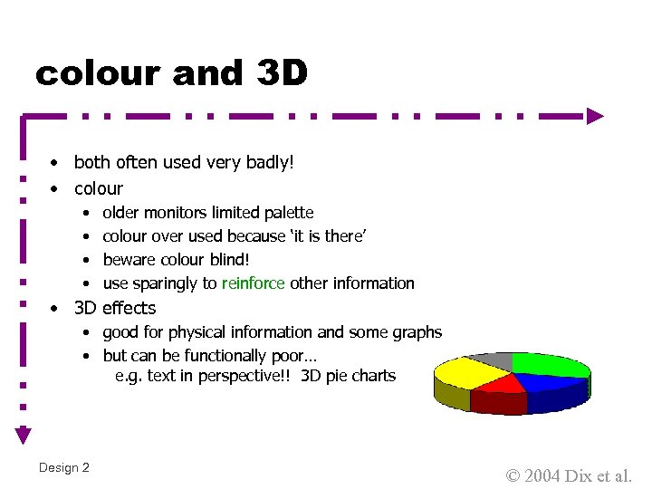 colour and 3 D • both often used very badly! • colour • • older monitors limited palette colour over used because ‘it is there’ beware colour blind! use sparingly to reinforce other information • 3 D effects • good for physical information and some graphs • but can be functionally poor… e. g. text in perspective!! 3 D pie charts Design 2 © 2004 Dix et al.