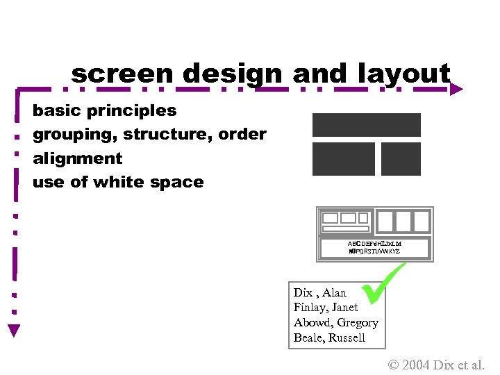 screen design and layout basic principles grouping, structure, order alignment use of white space ABCDEFGHIJKLM NOPQRSTUVWXYZ Dix , Alan Finlay, Janet Abowd, Gregory Beale, Russell © 2004 Dix et al.