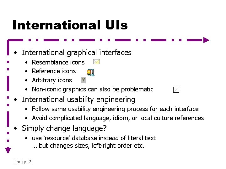 International UIs • International graphical interfaces • • Resemblance icons Reference icons Arbitrary icons Non-iconic graphics can also be problematic • International usability engineering • Follow same usability engineering process for each interface • Avoid complicated language, idiom, or local culture references • Simply change language? • use ‘resource’ database instead of literal text … but changes sizes, left-right order etc. Design 2
