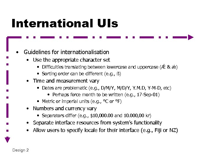 International UIs • Guidelines for internationalisation • Use the appropriate character set • Difficulties translating between lowercase and uppercase (Ǽ & ǽ) • Sorting order can be different (e. g. , ß) • Time and measurement vary • Dates are problematic (e. g. , D/M/Y, M/D/Y, Y. M. D, Y-M-D, etc) • Perhaps force month to be written (e. g. , 17 -Sep-01) • Metric or imperial units (e. g. , °C or °F) • Numbers and currency vary • Separators differ (e. g. , $10, 000. 00 and 10. 000, 00 kr) • Separate interface resources from system’s functionality • Allow users to specify locale for their interface (e. g. , Fiji or NZ) Design 2