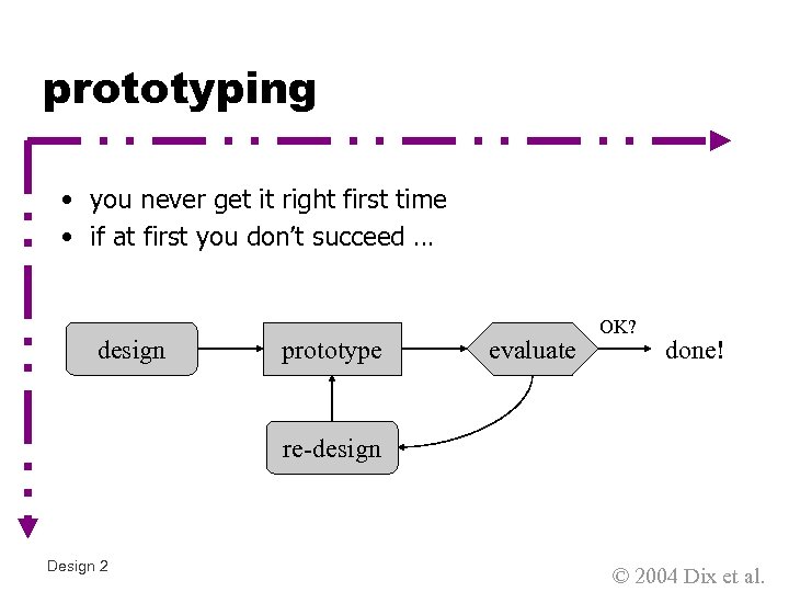 prototyping • you never get it right first time • if at first you don’t succeed … design prototype evaluate OK? done! re-design Design 2 © 2004 Dix et al.