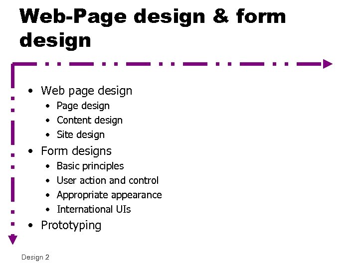 Web-Page design & form design • Web page design • Page design • Content design • Site design • Form designs • • Basic principles User action and control Appropriate appearance International UIs • Prototyping Design 2