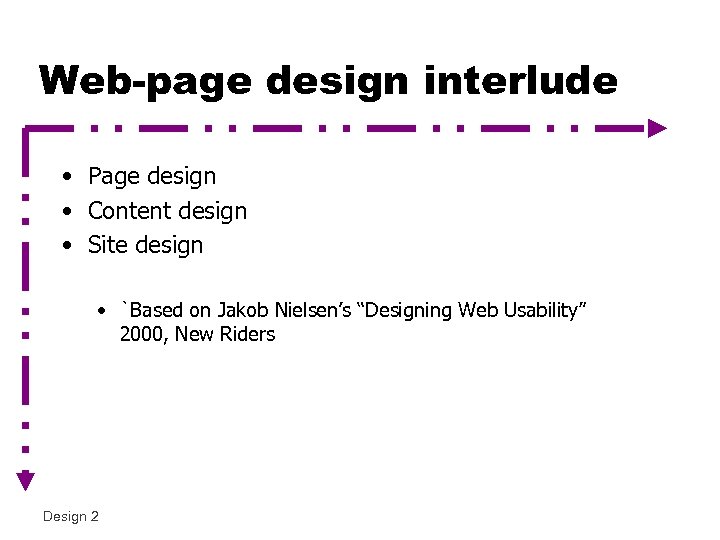 Web-page design interlude • Page design • Content design • Site design • `Based on Jakob Nielsen’s “Designing Web Usability” 2000, New Riders Design 2