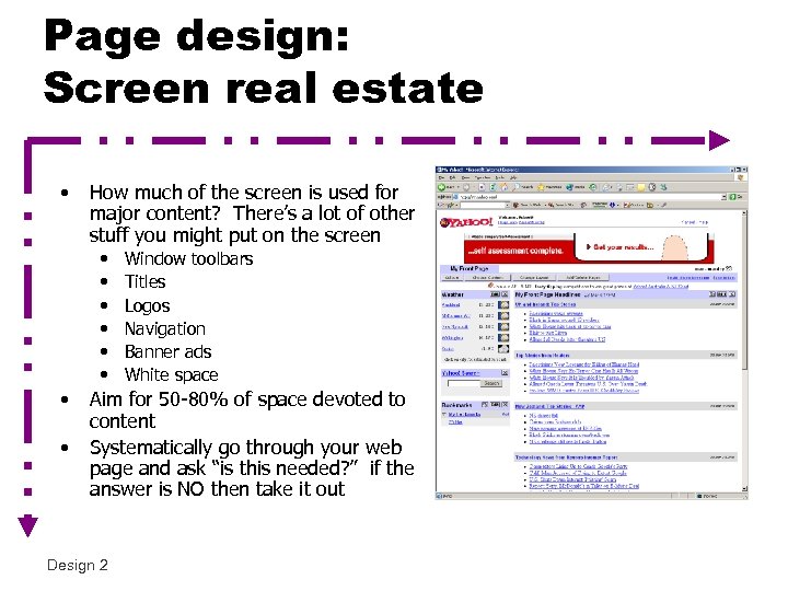 Page design: Screen real estate • How much of the screen is used for major content? There’s a lot of other stuff you might put on the screen • • Window toolbars Titles Logos Navigation Banner ads White space Aim for 50 -80% of space devoted to content Systematically go through your web page and ask “is this needed? ” if the answer is NO then take it out Design 2