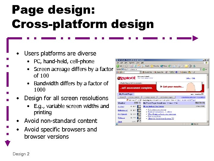 Page design: Cross-platform design • Users platforms are diverse • PC, hand-held, cell-phone • Screen acreage differs by a factor of 100 • Bandwidth differs by a factor of 1000 • Design for all screen resolutions • E. g. , variable screen widths and printing • Avoid non-standard content • Avoid specific browsers and browser versions Design 2