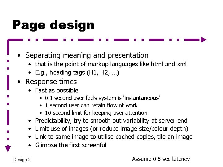 Page design • Separating meaning and presentation • that is the point of markup languages like html and xml • E. g. , heading tags (H 1, H 2, …) • Response times • Fast as possible • 0. 1 second user feels system is ‘instantaneous’ • 1 second user can retain flow of work • 10 second limit for keeping user attention • • Design 2 Predictability, try to smooth out variability at server end Limit use of images (or reduce image size/colour depth) Link to same image to utilise cached copies, tile an image Glimpse the first screenful Assume 0. 5 sec latency
