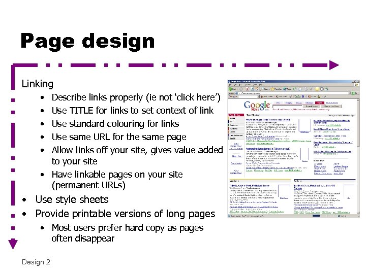 Page design Linking • • • Describe links properly (ie not ‘click here’) Use TITLE for links to set context of link Use standard colouring for links Use same URL for the same page Allow links off your site, gives value added to your site • Have linkable pages on your site (permanent URLs) • Use style sheets • Provide printable versions of long pages • Most users prefer hard copy as pages often disappear Design 2