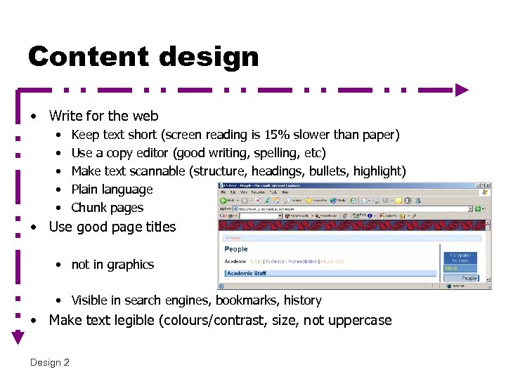 Content design • Write for the web • • • Keep text short (screen reading is 15% slower than paper) Use a copy editor (good writing, spelling, etc) Make text scannable (structure, headings, bullets, highlight) Plain language Chunk pages • Use good page titles • not in graphics • Visible in search engines, bookmarks, history • Make text legible (colours/contrast, size, not uppercase Design 2