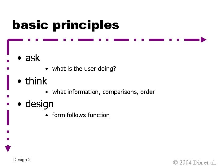 basic principles • ask • what is the user doing? • think • what information, comparisons, order • design • form follows function Design 2 © 2004 Dix et al.
