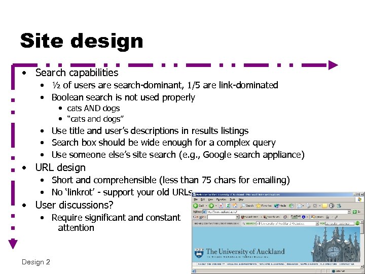 Site design • Search capabilities • ½ of users are search-dominant, 1/5 are link-dominated • Boolean search is not used properly • cats AND dogs • “cats and dogs” • Use title and user’s descriptions in results listings • Search box should be wide enough for a complex query • Use someone else’s site search (e. g. , Google search appliance) • URL design • Short and comprehensible (less than 75 chars for emailing) • No ‘linkrot’ - support your old URLs • User discussions? • Require significant and constant attention Design 2