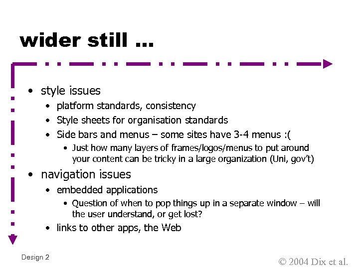 wider still … • style issues • platform standards, consistency • Style sheets for organisation standards • Side bars and menus – some sites have 3 -4 menus : ( • Just how many layers of frames/logos/menus to put around your content can be tricky in a large organization (Uni, gov’t) • navigation issues • embedded applications • Question of when to pop things up in a separate window – will the user understand, or get lost? • links to other apps, the Web Design 2 © 2004 Dix et al.