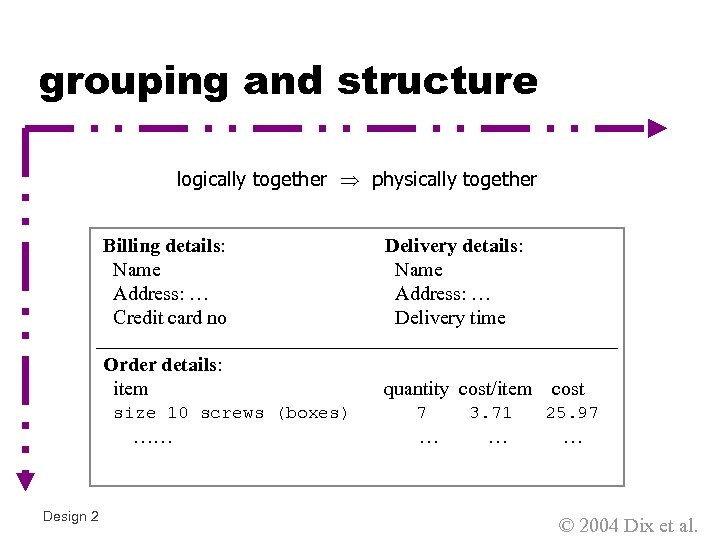grouping and structure logically together physically together Billing details: Name Address: … Credit card no Delivery details: Name Address: … Delivery time Order details: item quantity cost/item size 10 screws (boxes) …… Design 2 7 … 3. 71 … cost 25. 97 … © 2004 Dix et al.