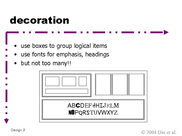 decoration • use boxes to group logical items • use fonts for emphasis, headings • but not too many!! ABCDEFGHIJKLM NOPQRSTUVWXYZ Design 2 © 2004 Dix et al.