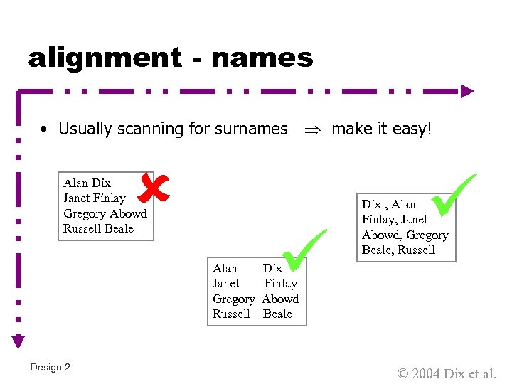 alignment - names • Usually scanning for surnames make it easy! Alan Dix Janet Finlay Gregory Abowd Russell Beale Alan Janet Gregory Russell Design 2 Dix , Alan Finlay, Janet Abowd, Gregory Beale, Russell Dix Finlay Abowd Beale © 2004 Dix et al.