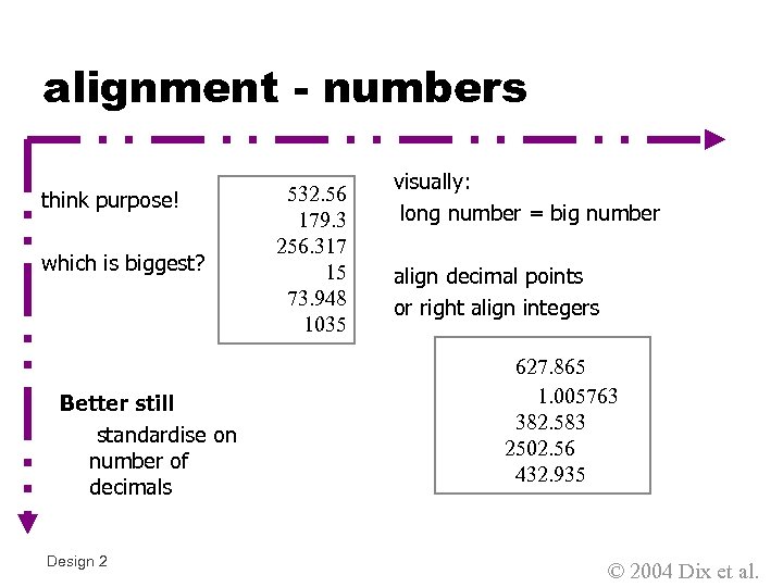alignment - numbers think purpose! which is biggest? Better still standardise on number of decimals Design 2 532. 56 179. 3 256. 317 15 73. 948 1035 visually: long number = big number align decimal points or right align integers 627. 865 1. 005763 382. 583 2502. 56 432. 935 © 2004 Dix et al.