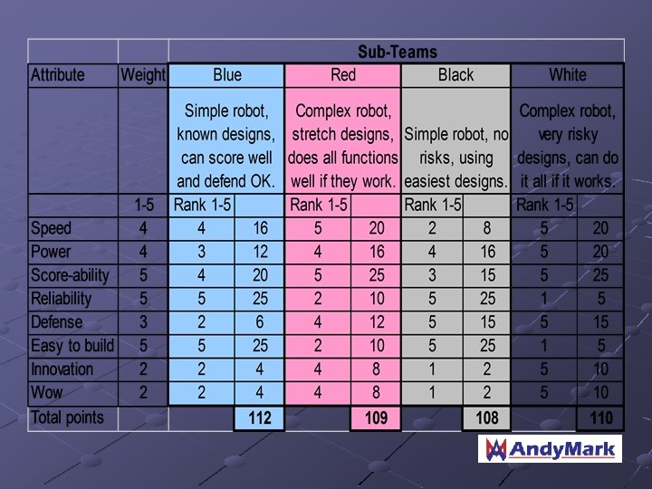 Designing a FRC Robot, a Team Approach Andy Baker President, Andy. Mark Inc. 11 year mentor on FRC team 45 2003 Championship Woodie Flowers Award Winner