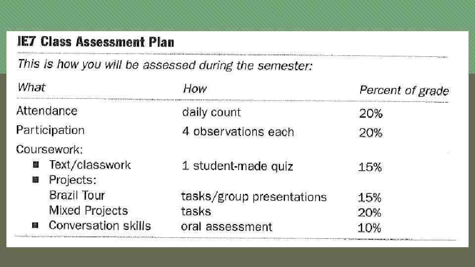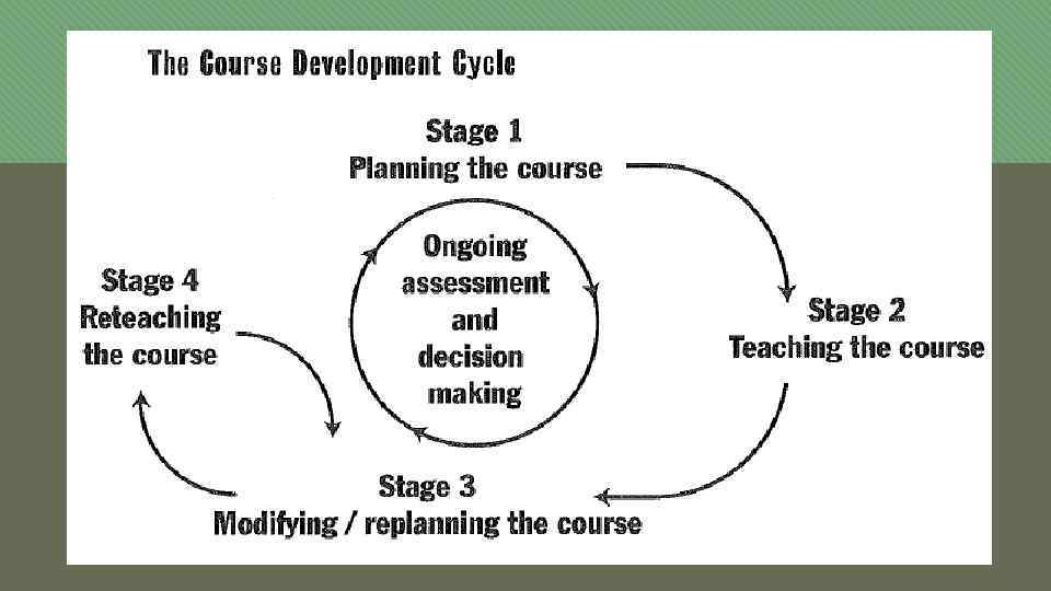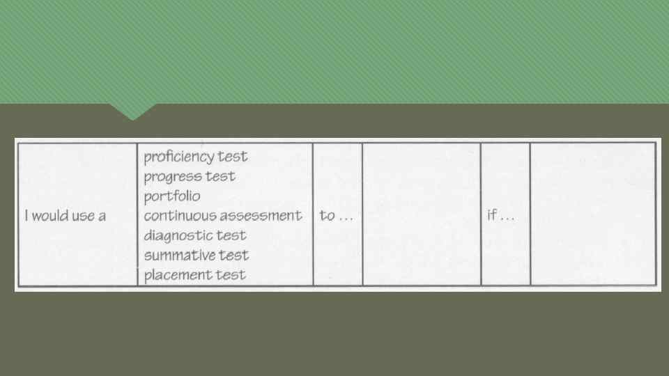 Assessment in course design Needs assessment • Learner needs? • How can T find out about Ls needs? • What can T do to address those needs? Language learning assessment • What is assessed? • Who • When assess(es) Ss? • How • When • What is done with the results of assessment? Course evaluation • Formative evaluation • Summative evaluation