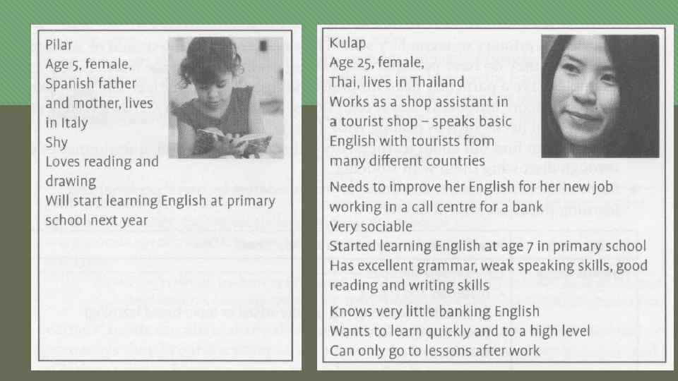 Different courses to meet different learner needs A 3 -day intensive course on exam strategies for students, taking a university entrance exam A series of one-to-one lessons over 8 weeks on business presentations A six-month course for future tourists focusing on social and daily survival English A short summer course in an English-speaking country for teenagers, involving lots of sports, trips to tourist sites and chatting with English teenagers A once-a-week course for a small group of accountants focusing on English for accountancy, and held in the learners’ company A four-week online course on writing business letters in English
