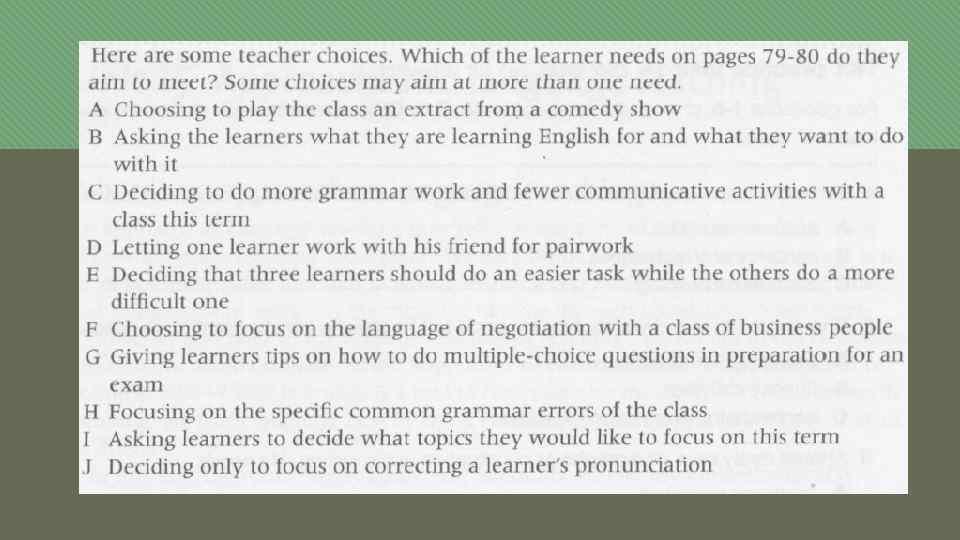 Learning needs Specific learning styles Specific target skills Exam strategies Learner autonomy Working at a suitable level