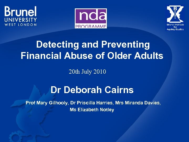 Detecting and Preventing Financial Abuse of Older Adults 20 th July 2010 Dr Deborah Cairns Prof Mary Gilhooly, Dr Priscilla Harries, Mrs Miranda Davies, Ms Elizabeth Notley