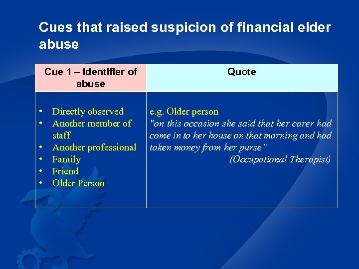 Cues that raised suspicion of financial elder abuse Cue 1 – Identifier of abuse • Directly observed • Another member of staff • Another professional • Family • Friend • Older Person Quote e. g. Older person "on this occasion she said that her carer had come in to her house on that morning and had taken money from her purse” (Occupational Therapist)