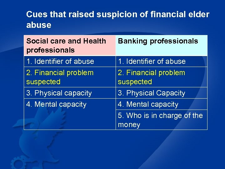 Cues that raised suspicion of financial elder abuse Social care and Health professionals 1. Identifier of abuse 2. Financial problem suspected Banking professionals 3. Physical capacity 4. Mental capacity 3. Physical Capacity 4. Mental capacity 5. Who is in charge of the money 1. Identifier of abuse 2. Financial problem suspected