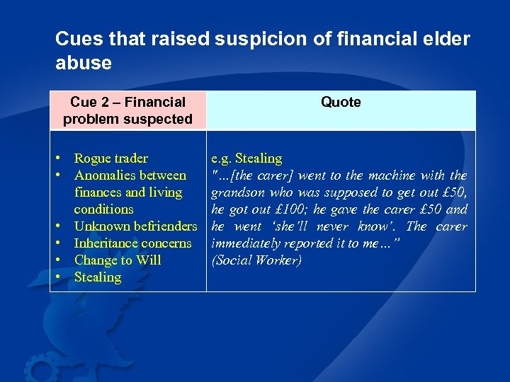 Cues that raised suspicion of financial elder abuse Cue 2 – Financial problem suspected Quote • Rogue trader • Anomalies between finances and living conditions • Unknown befrienders • Inheritance concerns • Change to Will • Stealing e. g. Stealing "…[the carer] went to the machine with the grandson who was supposed to get out £ 50, he got out £ 100; he gave the carer £ 50 and he went ‘she’ll never know’. The carer immediately reported it to me…” (Social Worker)