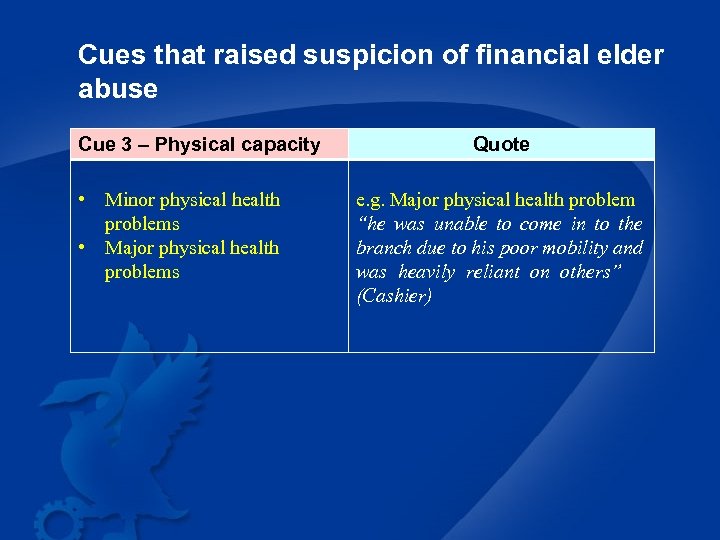 Cues that raised suspicion of financial elder abuse Cue 3 – Physical capacity • Minor physical health problems • Major physical health problems Quote e. g. Major physical health problem “he was unable to come in to the branch due to his poor mobility and was heavily reliant on others” (Cashier)