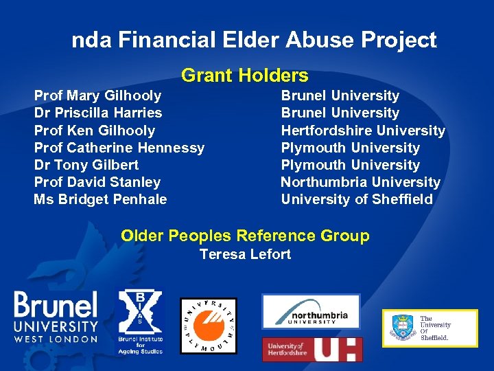 nda Financial Elder Abuse Project Grant Holders Prof Mary Gilhooly Dr Priscilla Harries Prof Ken Gilhooly Prof Catherine Hennessy Dr Tony Gilbert Prof David Stanley Ms Bridget Penhale Brunel University Hertfordshire University Plymouth University Northumbria University of Sheffield Older Peoples Reference Group Teresa Lefort