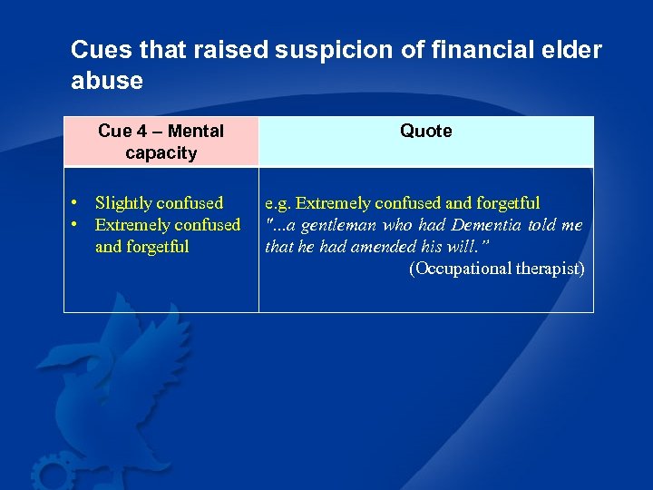 Cues that raised suspicion of financial elder abuse Cue 4 – Mental capacity • Slightly confused • Extremely confused and forgetful Quote e. g. Extremely confused and forgetful ". . . a gentleman who had Dementia told me that he had amended his will. ” (Occupational therapist)
