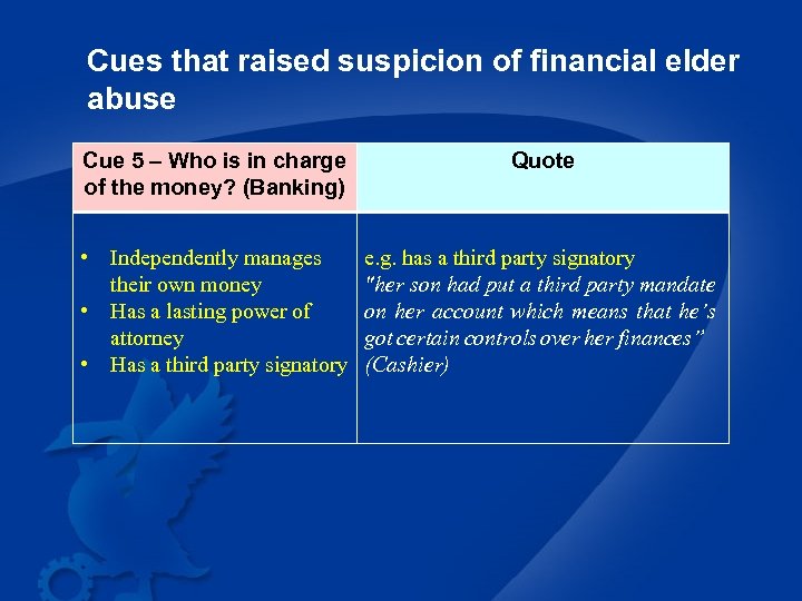 Cues that raised suspicion of financial elder abuse Cue 5 – Who is in charge of the money? (Banking) Quote • Independently manages their own money • Has a lasting power of attorney • Has a third party signatory e. g. has a third party signatory "her son had put a third party mandate on her account which means that he’s got certain controls over her finances” (Cashier)