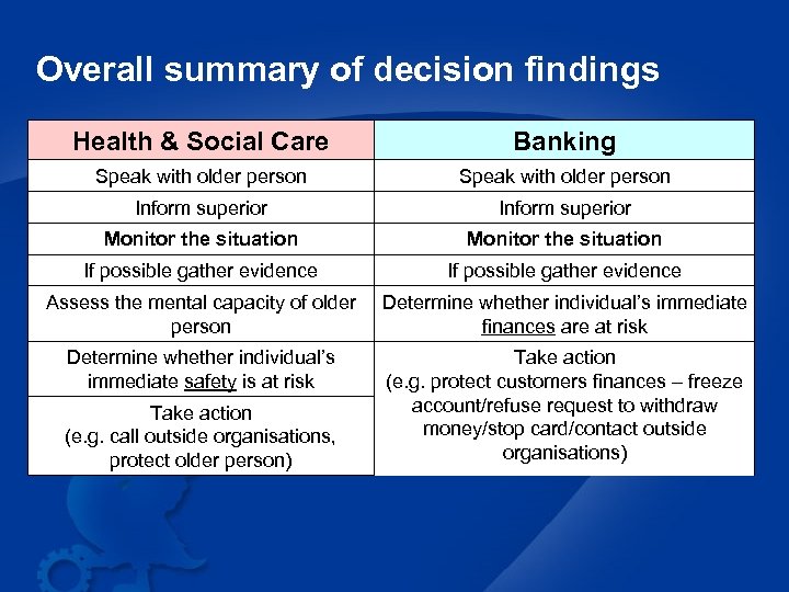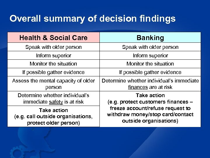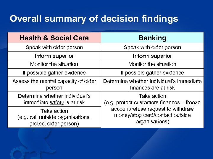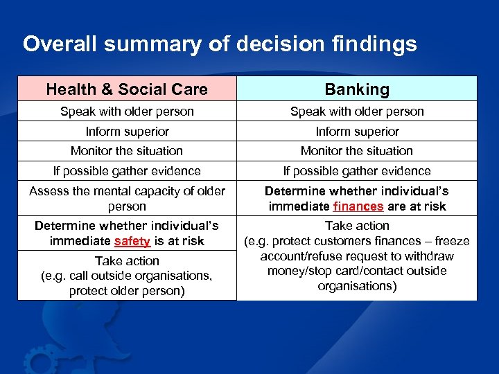 Overall summary of decision findings Health & Social Care Banking Speak with older person Inform superior Monitor the situation If possible gather evidence Assess the mental capacity of older person Determine whether individual’s immediate finances are at risk Determine whether individual’s immediate safety is at risk Take action (e. g. protect customers finances – freeze account/refuse request to withdraw money/stop card/contact outside organisations) Take action (e. g. call outside organisations, protect older person)