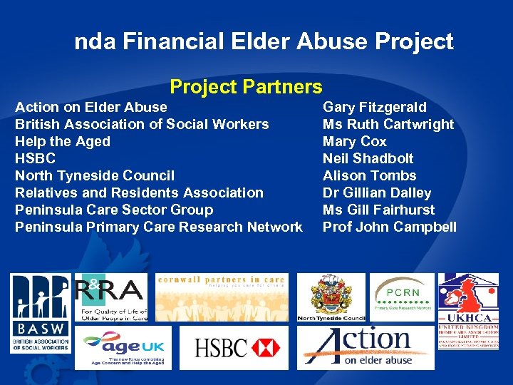 nda Financial Elder Abuse Project Partners Action on Elder Abuse British Association of Social Workers Help the Aged HSBC North Tyneside Council Relatives and Residents Association Peninsula Care Sector Group Peninsula Primary Care Research Network Gary Fitzgerald Ms Ruth Cartwright Mary Cox Neil Shadbolt Alison Tombs Dr Gillian Dalley Ms Gill Fairhurst Prof John Campbell