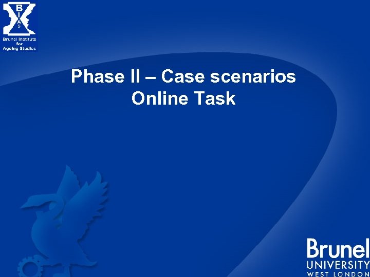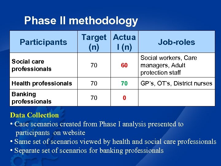 Phase II methodology Participants Target Actua (n) l (n) Job-roles Social care professionals 70 60 Social workers, Care managers, Adult protection staff Health professionals 70 70 GP’s, OT’s, District nurses Banking professionals 70 0 Data Collection • Case scenarios created from Phase I analysis presented to participants on website • Same set of scenarios viewed by health and social care professionals • Separate set of scenarios for banking professionals