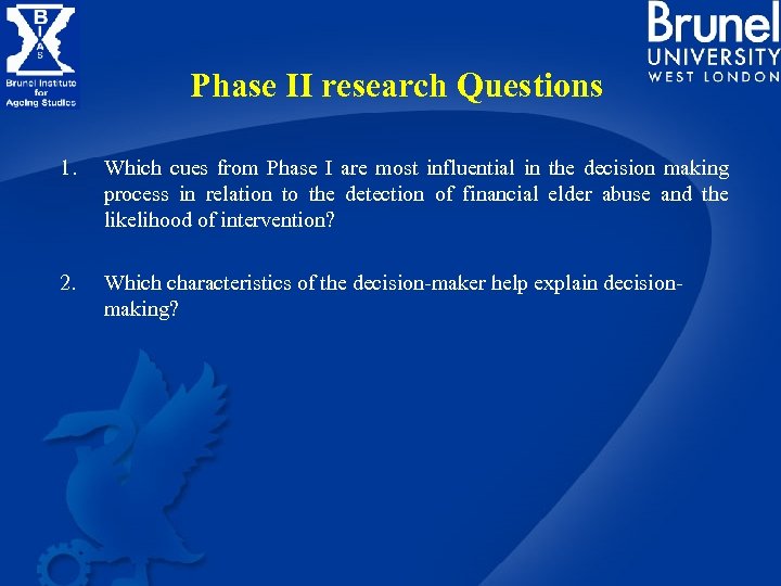 Phase II research Questions 1. Which cues from Phase I are most influential in the decision making process in relation to the detection of financial elder abuse and the likelihood of intervention? 2. Which characteristics of the decision-maker help explain decisionmaking?